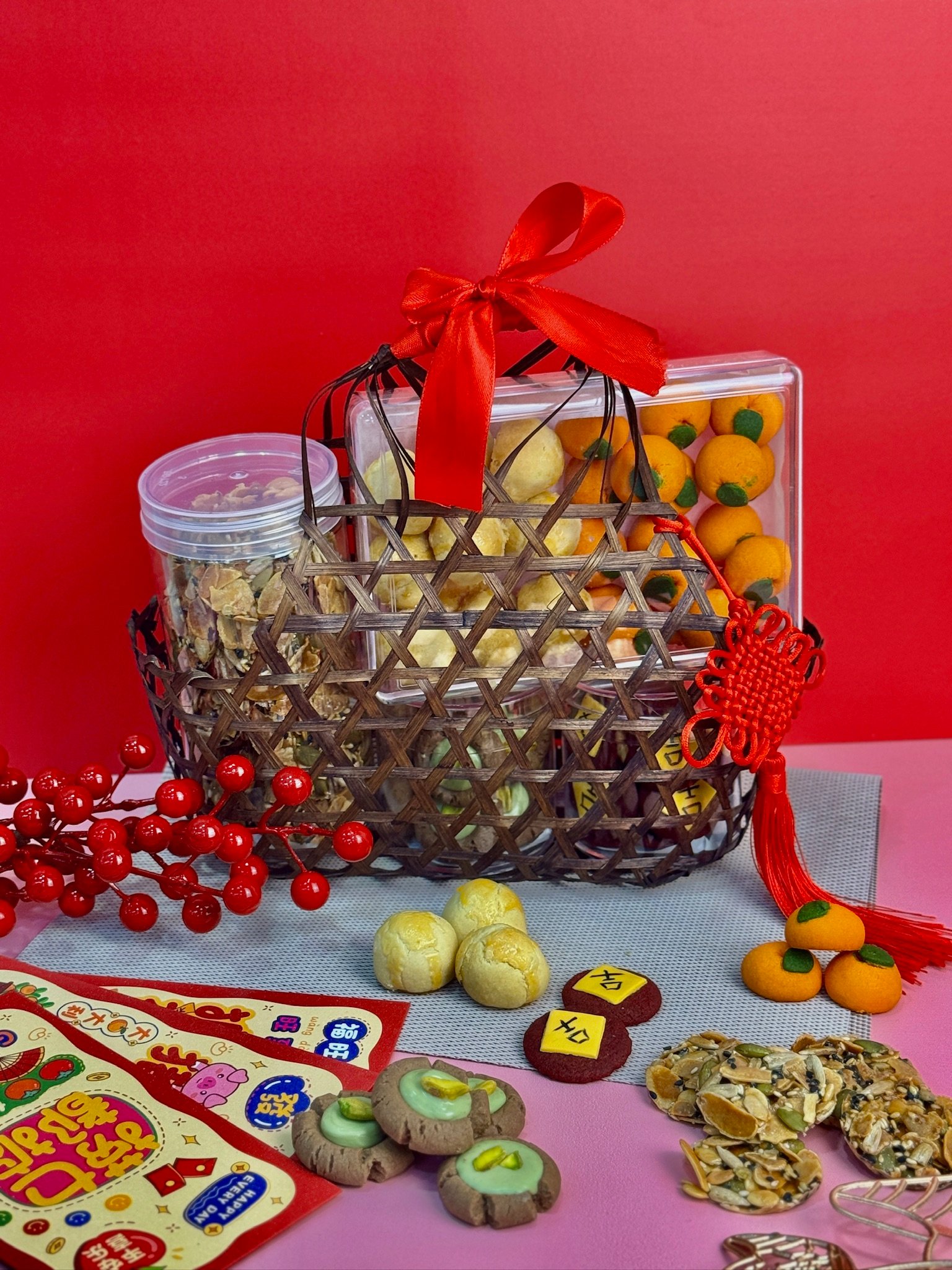 - Luxurious Decorative Red Knot – A high-quality ornament symbolizing good fortune and unity, elevating the hamper’s presentation while honoring traditional customs.